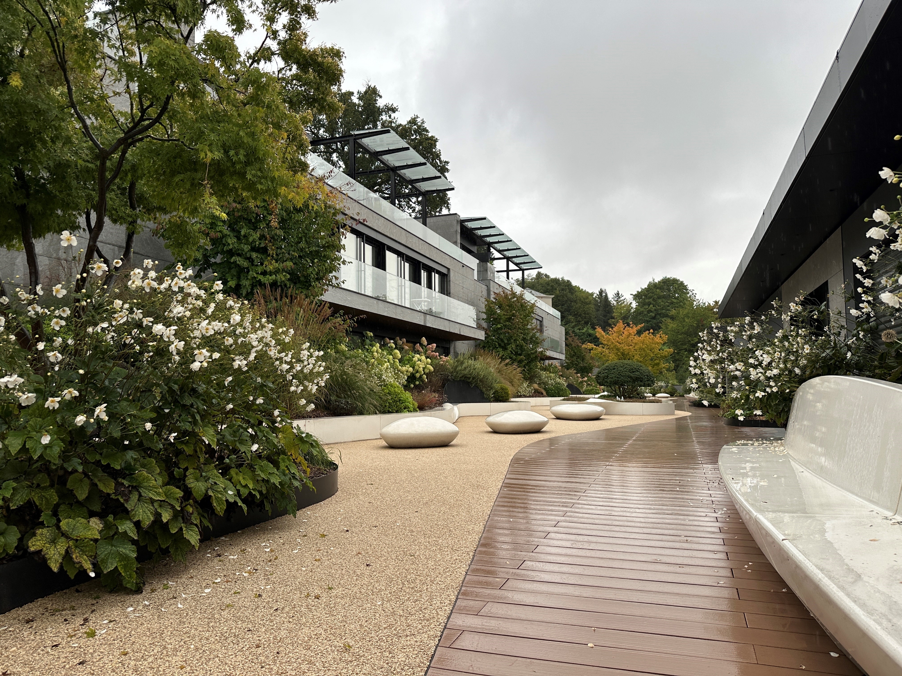 Plus loin, sur la place commune, des éléments préfabriqués maintiennent le talus paysager et servent également d'assise aux résidents. Cet espace est agrémenté d'un bassin miroir et d'un cheminement en platelage bois recomposit.
