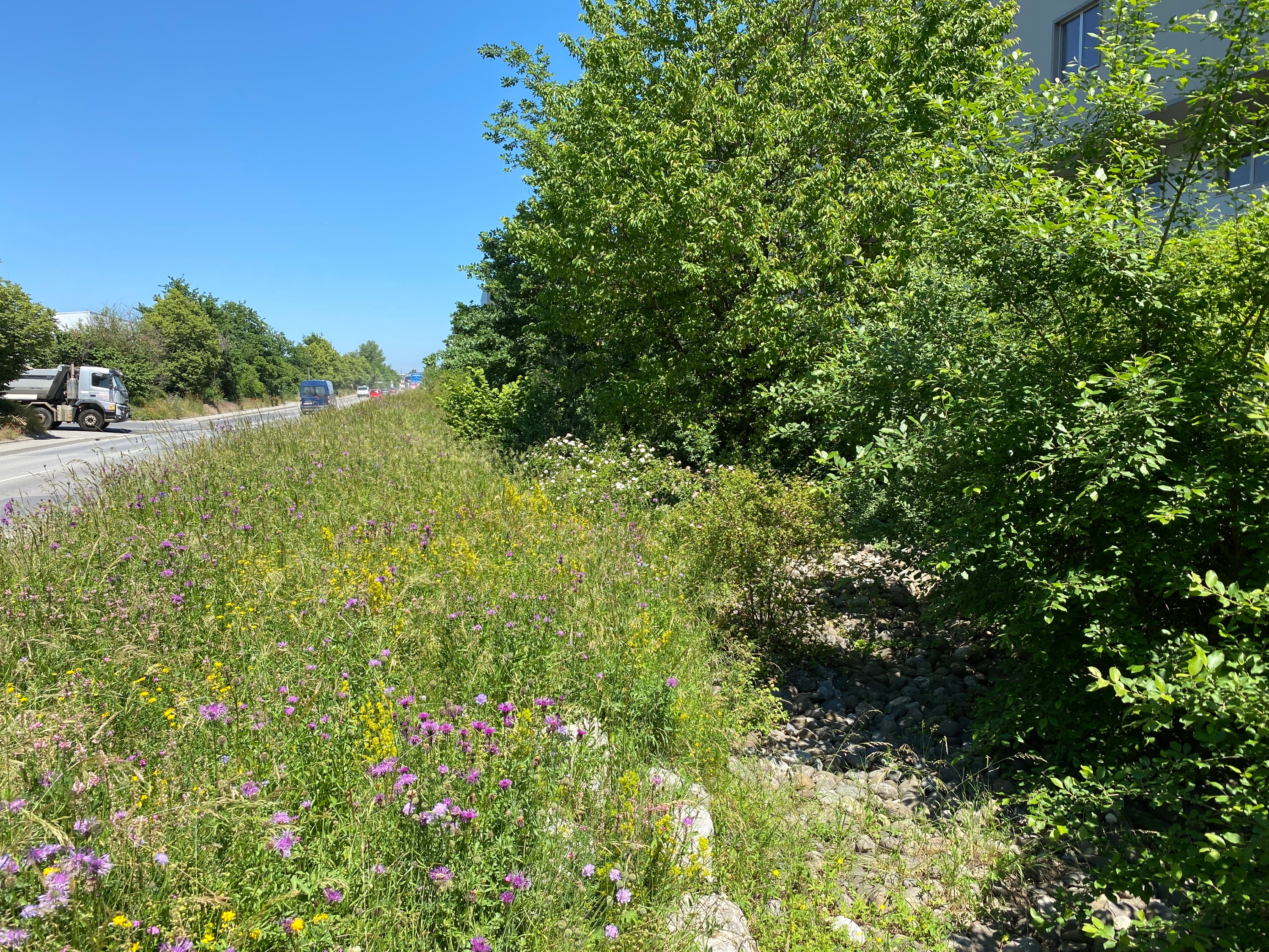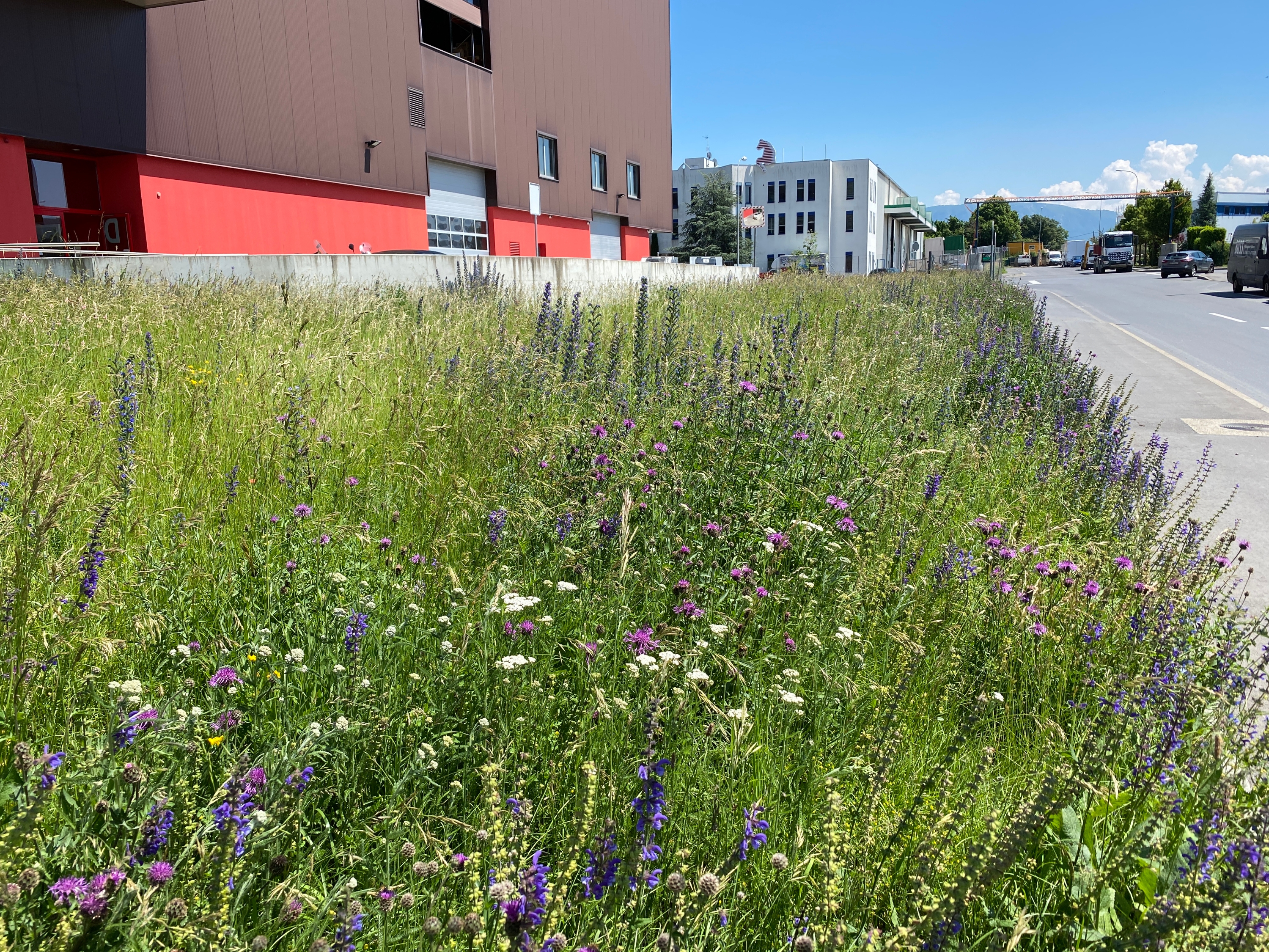 Ce bassin d'infiltration récupère les eaux de toiture des nouvelles constructions adjacentes. Ce projet écologiquement riche est composé d'arbres, arbustes et prairies sèches indigènes ainsi que d'une succession de bassins dont vont pouvoir profiter la faune et la flore.