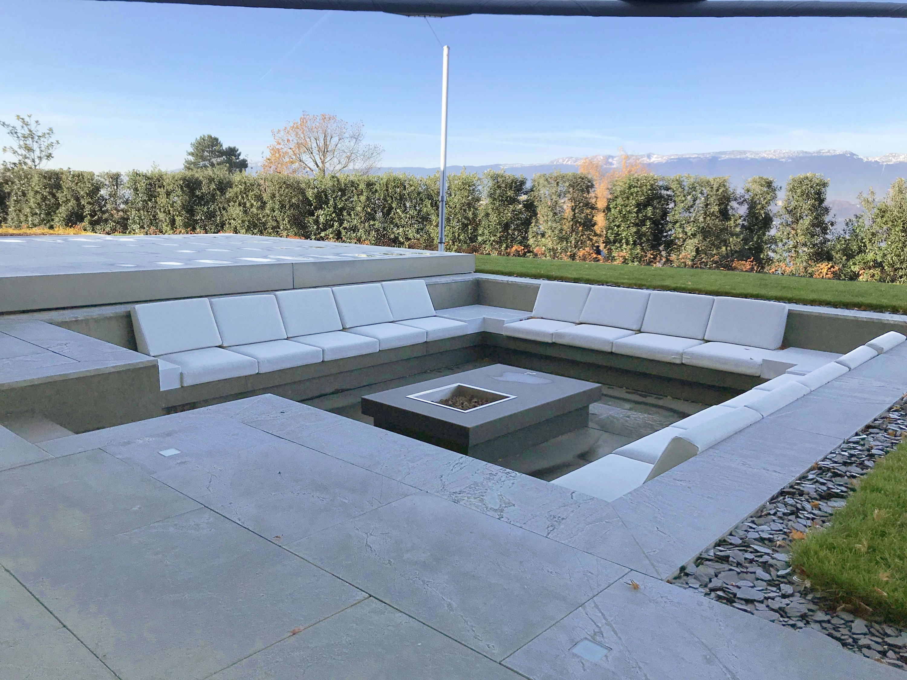 La pente devient la force de ce projet grâce à un jeu de terrasses, au dégagement et au cadrage de vues. On y trouve un salon d'extérieur encastré avec puits de feu à gaz, une terrasse en bois cachant le spa extérieur. Nous avons également réalisé la plantation d'arbres de plus de 8 mètres, de bonsaïs géants, d'un mur d'eau en pierre polie-miroir, de mur végétalisé et de terrasse de piscine à fond amovible.