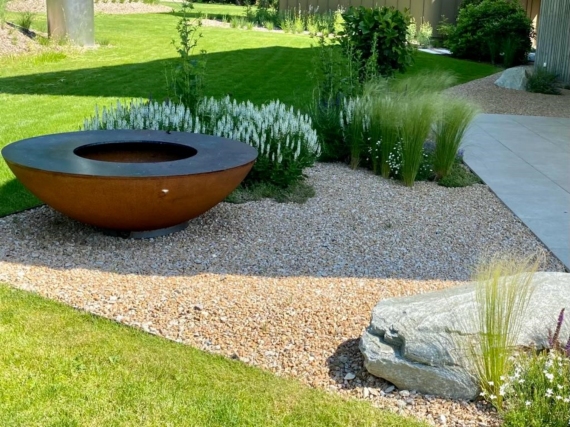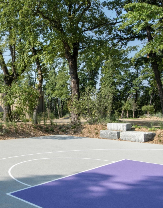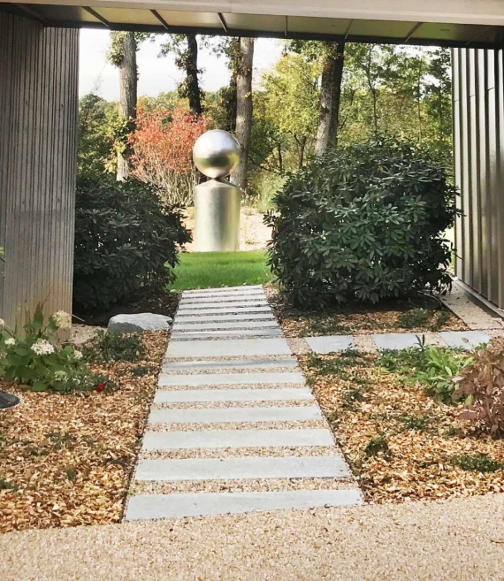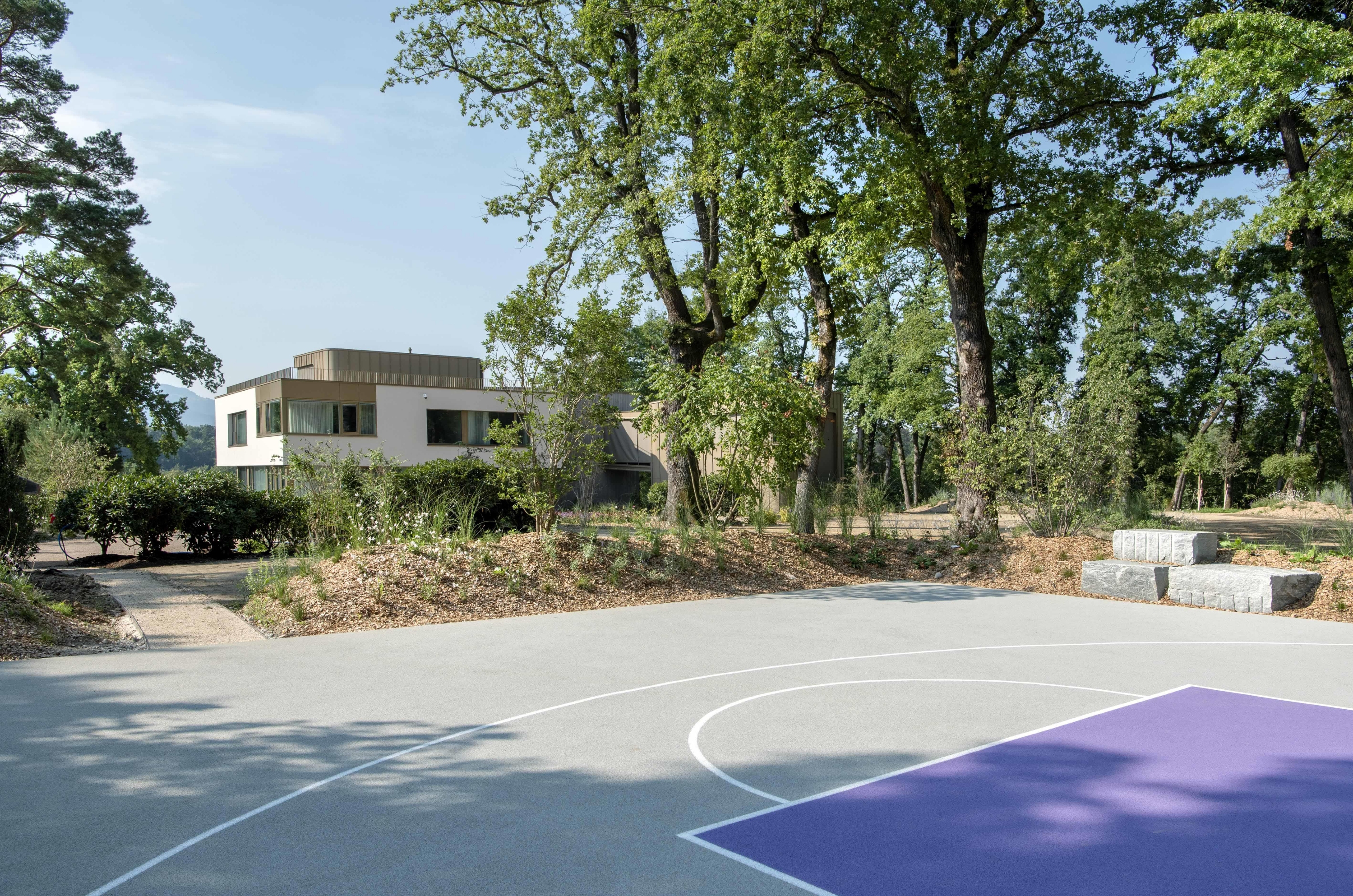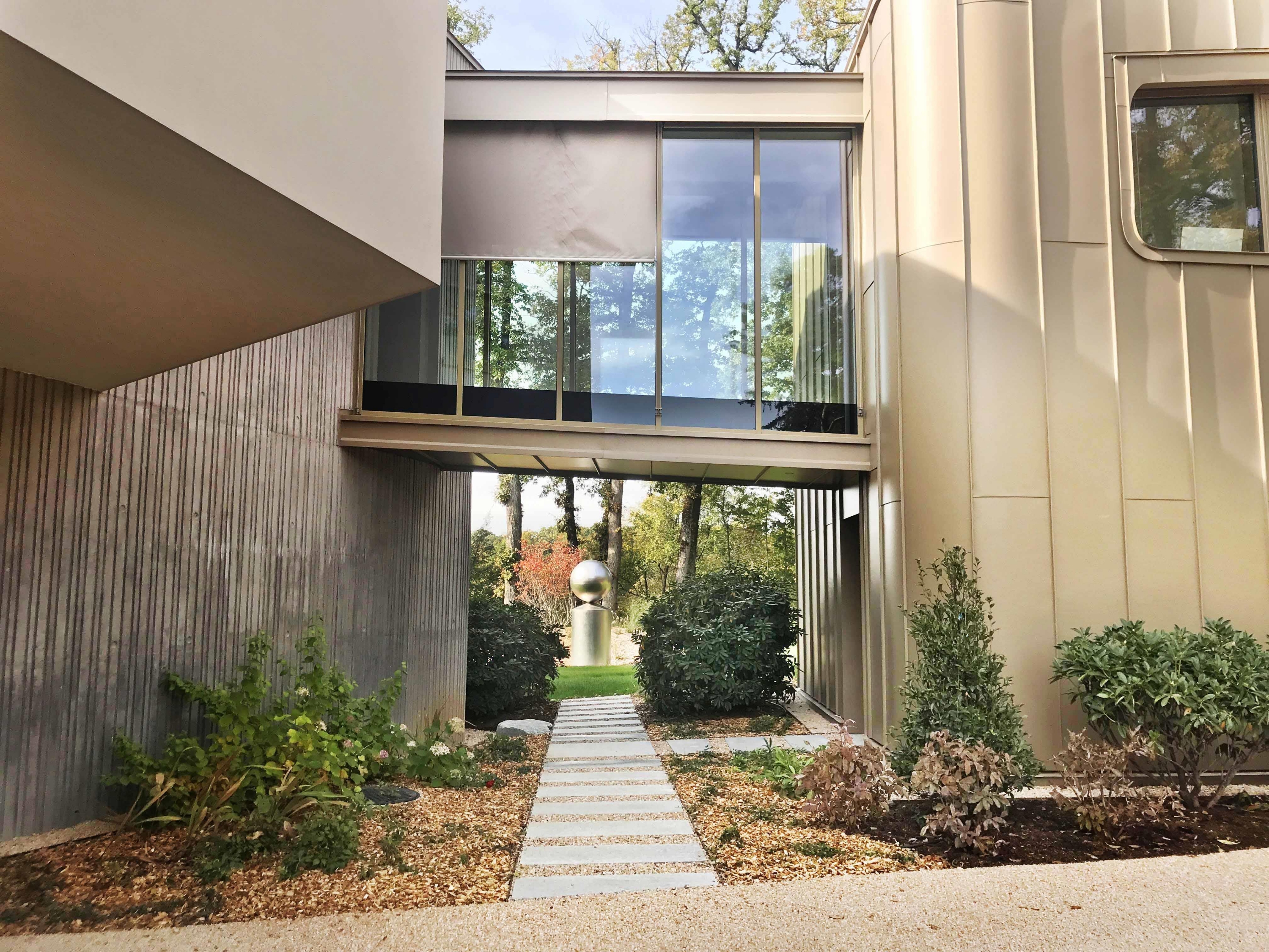 Le chemin de ronde nous emmène de la villa aux bois par un cheminement jalonné de terrasses, sculptures, kiosque classique, pergola, belvédère avec vue sur l'Arve et le Salève. Une chambre végétalisée fait la transition entre la piscine et la piscine intérieure.